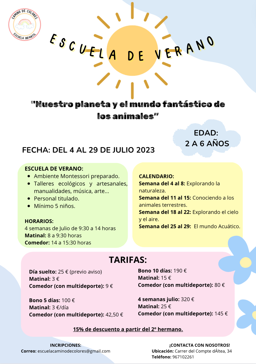 El campamento de verano Montessori que tendrá lugar del 2 al 27 de Julio.